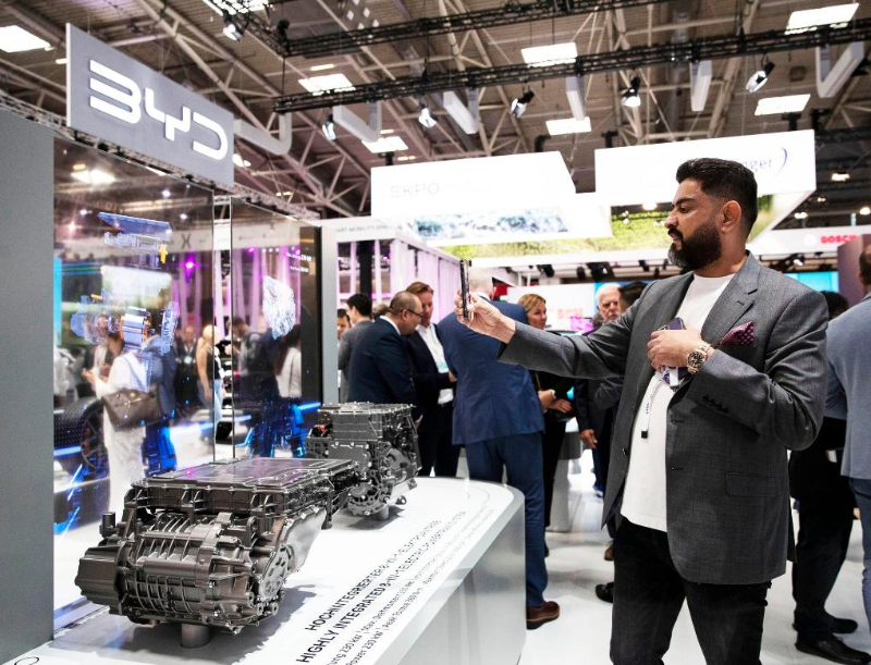 (資料圖片)2023年9月4日,一名參觀者在德國慕尼黑國際車展媒體預(yù)展上拍攝比亞迪的展品。新華社記者張帆攝