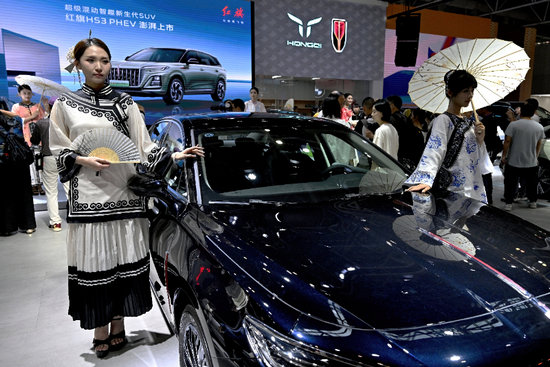 10月1日,在第44屆中國(guó)(福州)國(guó)際汽車博覽會(huì)暨第3屆中國(guó)(福州)國(guó)際智能網(wǎng)聯(lián)汽車體驗(yàn)博覽會(huì)上,模特展示一款紅旗新車型。新華社記者 魏培全 攝