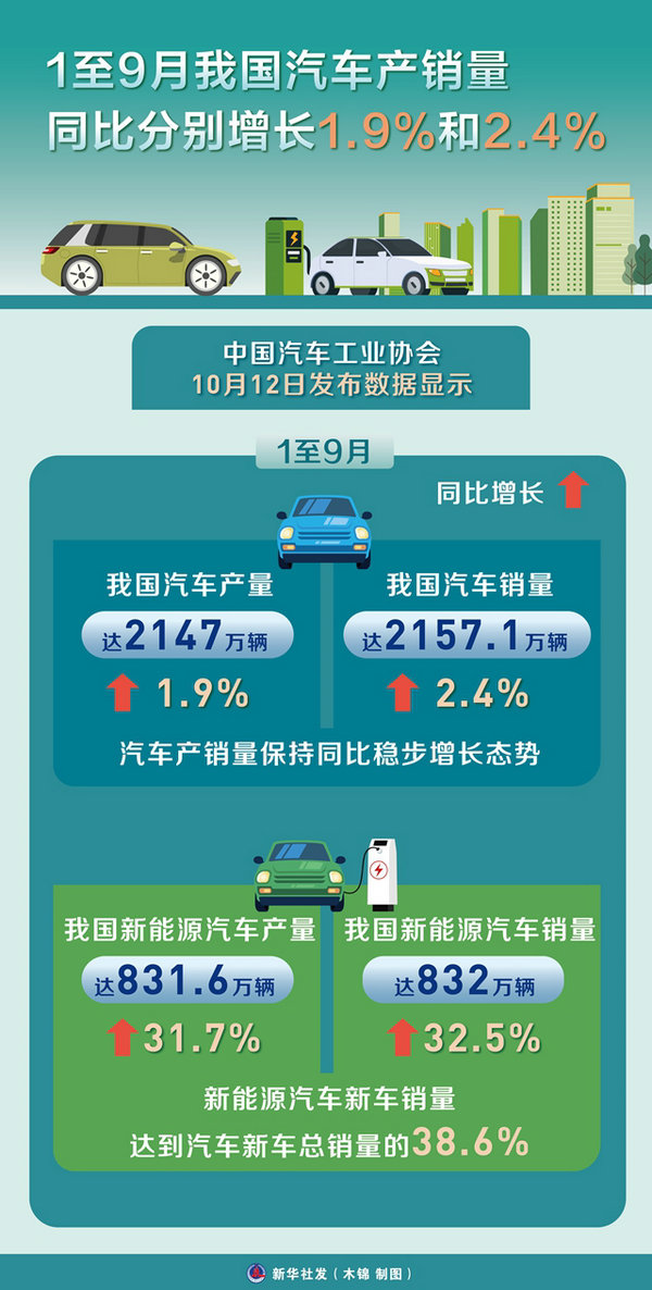 1至9月,我國(guó)新能源汽車產(chǎn)銷量達(dá)831.6萬(wàn)輛和832萬(wàn)輛,同比分別增長(zhǎng)31.7%和32.5%,新能源汽車新車銷量達(dá)到汽車新車總銷量的38.6%。