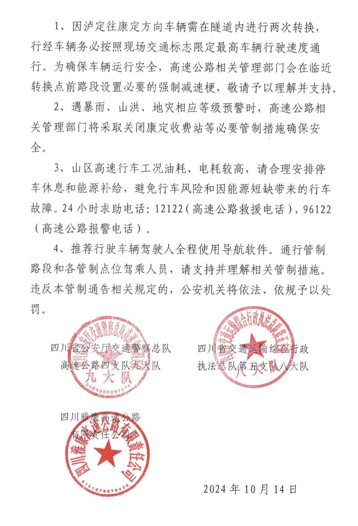 10月14日晚,四川高速公安四分局發(fā)布關(guān)于G4218雅葉高速公路瀘定至康定路段實(shí)施交通管制通告。管制措施包括: