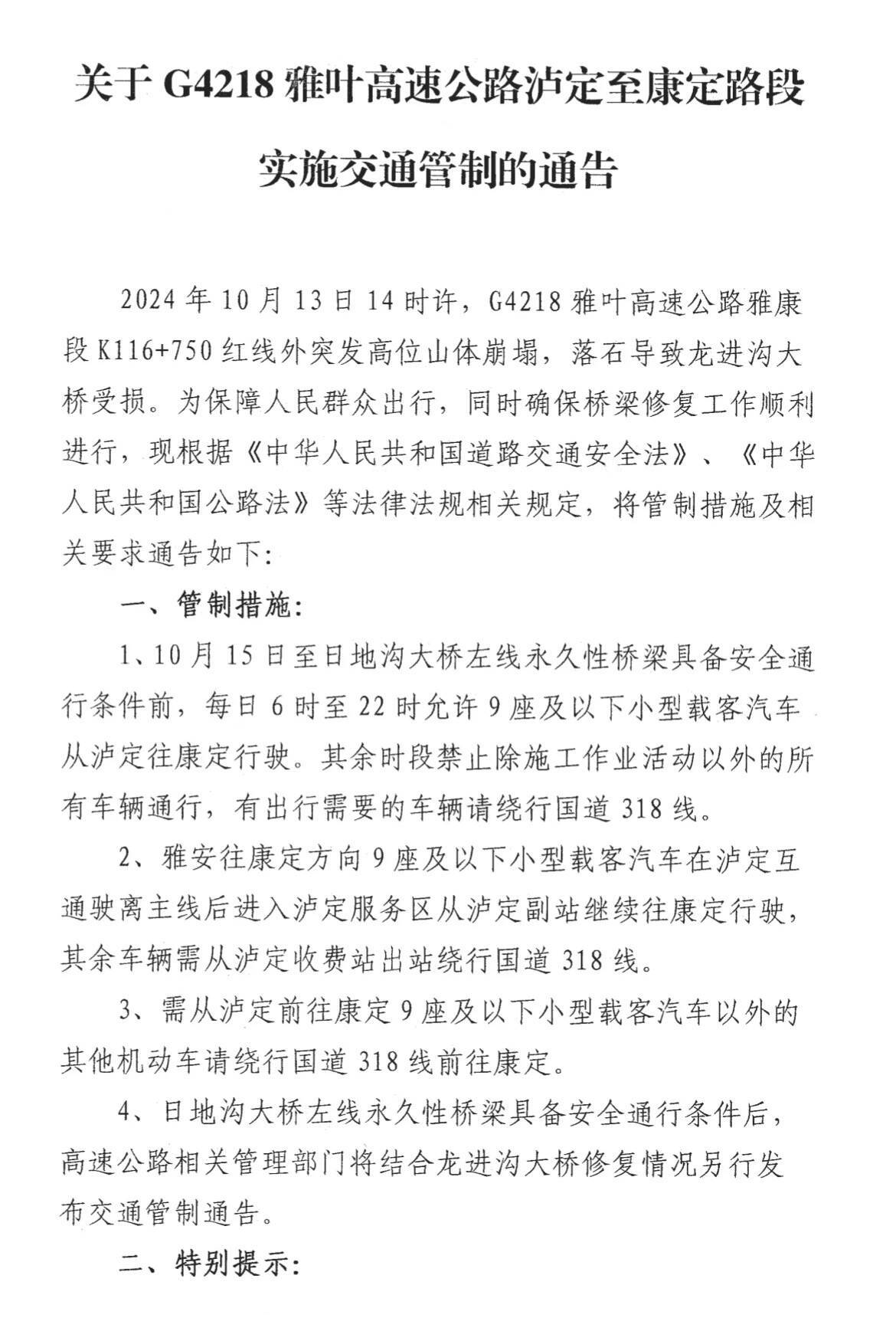 1、10月15日至日地溝大橋左線永久性橋梁具備安全通行條件前,每日6時(shí)至22時(shí)允許9座及以下小型載客汽車從瀘定往康定行駛。其余時(shí)段禁止除施工作業(yè)活動(dòng)以外的所有車輛通行,有出行需要的車輛請(qǐng)繞行國道318線。