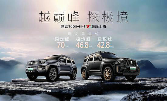 越巔峰,探極境。2月26日,“中國豪華越野旗艦”坦克700 Hi4-T發(fā)布上市,坦克700 Hi4-T限定版建議零售價(jià)70萬元,極境版建議零售價(jià)46。8萬元,極致版建議零售價(jià)42。8萬元。