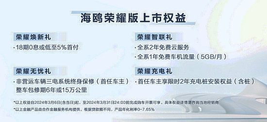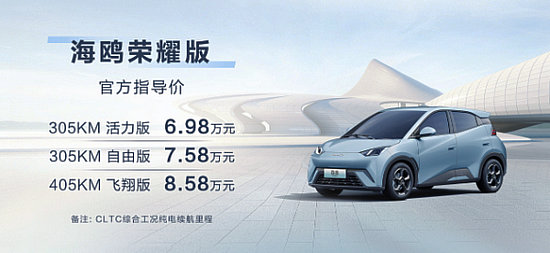 比亞迪海鷗自去年4月上市以來持續(xù)熱銷,2023年以年銷280217輛的成績獲A00級市場年度銷冠。承襲冠軍品質(zhì)與高能實力,3月6日,海鷗榮耀版正式上市,官方指導價格為6。98萬元-8。58萬元。海鷗榮耀版增色降價,新增北冰藍外觀+深海藍內(nèi)飾配色,以全新的配色方案與多彩個性體驗,豐富用戶的購車選擇,更好滿足用戶的個性化需求。