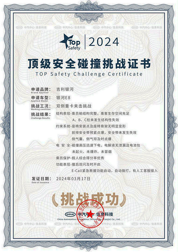 測試結果顯示,銀河 E8 各維度表現優(yōu)異。在結構表現上,乘員艙結構完整,生存空間充足,A、B、C 柱未發(fā)生結構性失效;在約束系統(tǒng)上,座椅安裝點及座椅骨架無明顯變形,前排安全帶預緊點爆,安全帶未發(fā)生失效,側氣囊、側氣簾及時點爆;在電安全上,銀河 E8 碰撞后高壓迅速下電,電解液無泄露,且電池包未起火、未爆炸、未冒煙;在乘員保護上,車內假人綜合得分率優(yōu)秀。值得注意的是,銀河 E8 碰撞后雙閃及時開啟,門把手自動彈出,E-Call 緊急救援電話自動撥打,有人工客服接入。