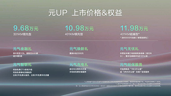 3月26日,比亞迪首款搭載e平臺3。0的A0級純電SUV——元UP正式上市。新車共有3個款型,官方指導(dǎo)價9。68萬元—11。98萬元。同時,官方還推出了元氣金融禮、元氣煥新禮、元氣無憂禮、元氣智聯(lián)禮、元氣充電禮、元氣延保服務(wù)六大上市權(quán)益。