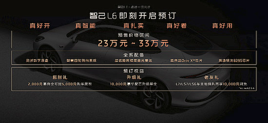 當日,智己L6正式開啟預售,預售價格區(qū)間:23萬元~33萬元。智己L6 Max標準版,不超過23萬元;智己L6 Max超強性能版,不超過29。99萬元;智己L6 Max光年版,不超過33萬元。同期,也公布了極具誠意的“限時預訂權益”,2000元意向金即可抵5000元購車尾款,以及10000元豪華配置升級基金。