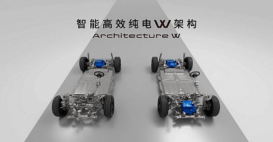 “W”架構(gòu)提供單電機(jī)后輪驅(qū)動(dòng)和雙電機(jī)四輪驅(qū)動(dòng)兩種驅(qū)動(dòng)形式。其中,單電機(jī)后輪驅(qū)動(dòng)依靠高功率后驅(qū)電機(jī),實(shí)現(xiàn)前后50:50的重量分配;雙電機(jī)四輪驅(qū)動(dòng)依靠前后兩組高功率驅(qū)動(dòng)電機(jī),搭配電子懸架,并根據(jù)不同路況和駕駛需求,精準(zhǔn)分配前后輪動(dòng)力。