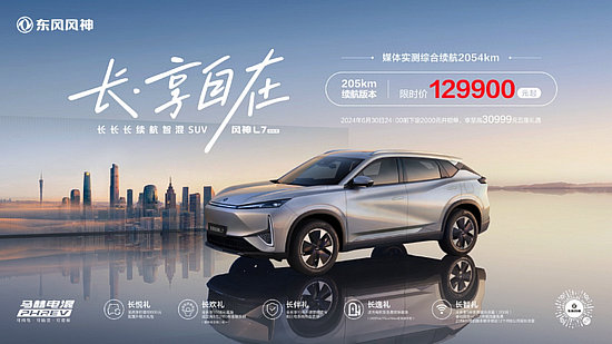 5月24日,備受期待的東風(fēng)風(fēng)神L7在武漢國際博覽中心正式上市發(fā)布,于北京車展正式開售的東風(fēng)風(fēng)神L7,公布全系車型限時(shí)搶先價(jià)及用戶權(quán)益。其中,205km純電續(xù)航版本車型限時(shí)搶先價(jià)12.99萬元起。