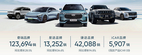 四大主力乘用車(chē)品牌中:奇瑞品牌6月銷(xiāo)量123,694輛,同比增長(zhǎng)28.5%;1-6月銷(xiāo)量706,767輛,同比增長(zhǎng)41.9%;星途品牌6月銷(xiāo)量13,252輛,同比增長(zhǎng)34.6%;1-6月銷(xiāo)量54,447輛,同比增長(zhǎng)28.9%;捷途品牌6月銷(xiāo)量42,088輛,同比增長(zhǎng)94.8%;1-6月銷(xiāo)量223,555輛,同比增長(zhǎng)98。9%;iCAR品牌 首款產(chǎn)品上市4個(gè)月,6月銷(xiāo)量5,907輛;1-6月銷(xiāo)量25,586輛。