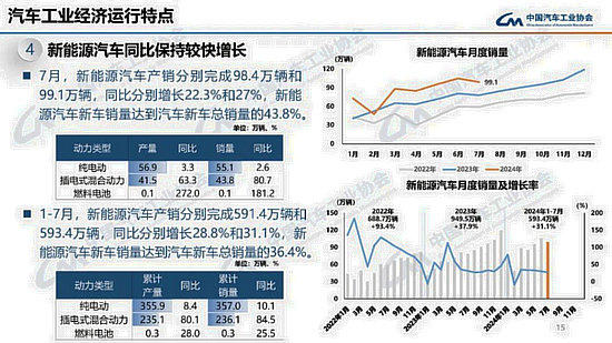 在新能源汽車方面,1-7月,新能源汽車產(chǎn)銷分別完成591.4萬(wàn)輛和593.4萬(wàn)輛,同比分別增長(zhǎng)28.8%和31.1%,新能源汽車新車銷量達(dá)到汽車新車總銷量的36.4%。7月,新能源汽車產(chǎn)銷分別完成98.4萬(wàn)輛和99.1萬(wàn)輛,同比分別增長(zhǎng)22.3%和27%,新能源汽車新車銷量達(dá)到汽車新車總銷量的43.8%。