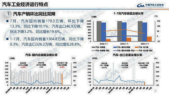 8月9日,中國(guó)汽車工業(yè)協(xié)會(huì)發(fā)布2024年7月汽車工業(yè)產(chǎn)銷情況。數(shù)據(jù)顯示,7月,汽車產(chǎn)銷分別完成228.6萬(wàn)輛和226.2萬(wàn)輛,環(huán)比分別下降8.8%和11.4%,同比分別下降4.8%和5.2%。據(jù)中國(guó)汽車工業(yè)協(xié)會(huì)分析,7月,車市進(jìn)入傳統(tǒng)淡季,部分廠家迎來(lái)高溫休假,產(chǎn)銷節(jié)奏有所放緩,整體市場(chǎng)表現(xiàn)相對(duì)平淡,環(huán)比同比均呈現(xiàn)下降。其中,乘用車和商用車產(chǎn)銷環(huán)比同比雙降,新能源汽車和汽車出口同比繼續(xù)保持較快增長(zhǎng)。