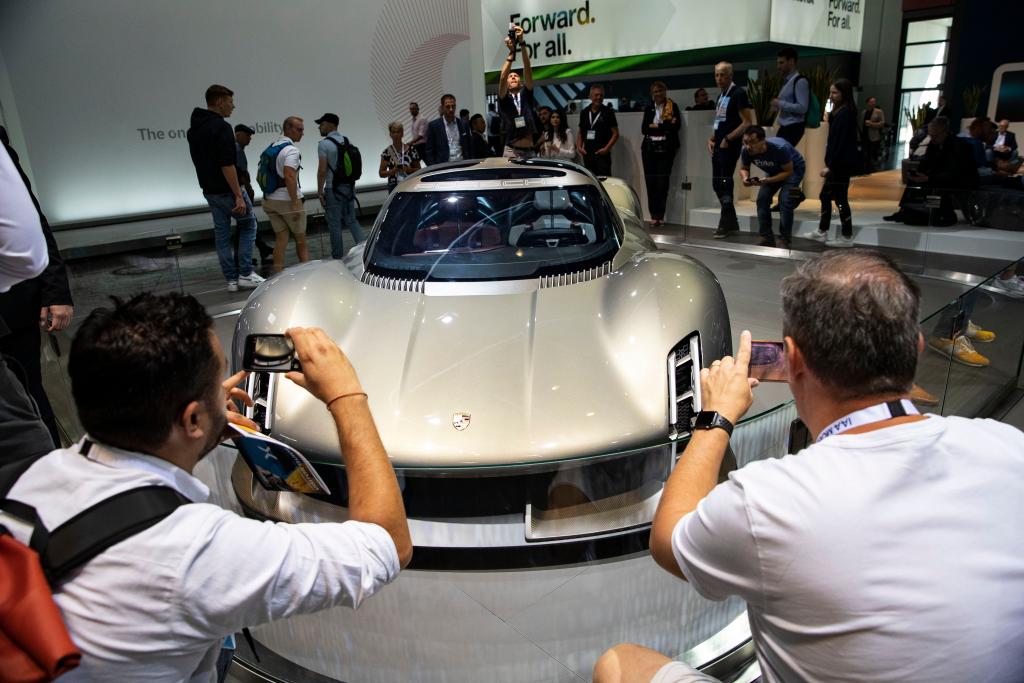 2023年9月5日,在德國(guó)慕尼黑,人們?cè)诘聡?guó)國(guó)際汽車(chē)及智慧出行博覽會(huì)上拍攝一款保時(shí)捷展車(chē)。新華社記者張帆攝