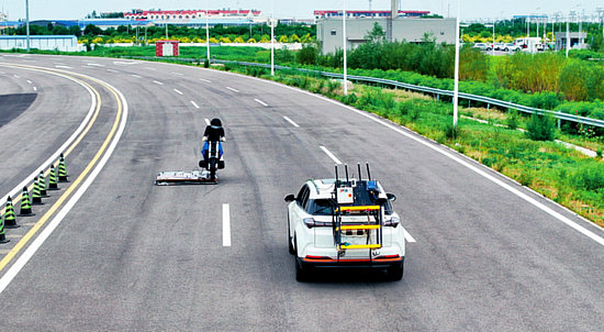測試車輛在天津(西青)國家級車聯(lián)網(wǎng)先導(dǎo)區(qū)封閉測試場內(nèi)進(jìn)行自動駕駛主動安全功能測試 (2024年6月14日攝) 孫凡越攝