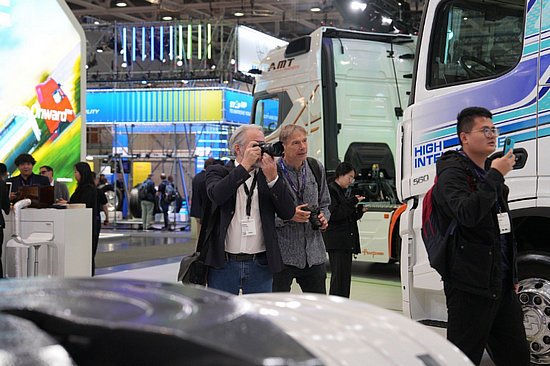 圖為國際觀展人士在展會現(xiàn)場拍攝陜汽展出的產(chǎn)品。