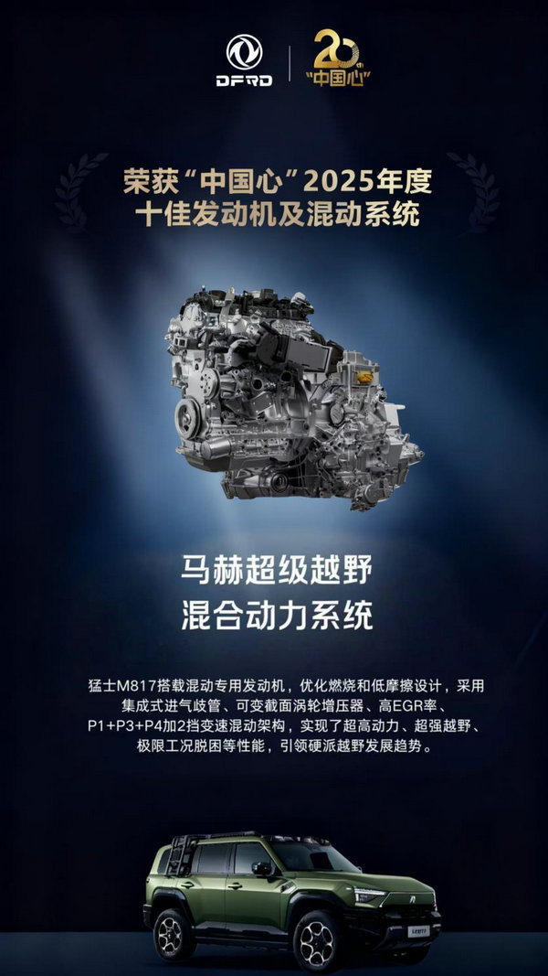 東風(fēng)自主動(dòng)力再次迎來(lái)高光時(shí)刻。近日,“中國(guó)心”2025年度十佳發(fā)動(dòng)機(jī)及混動(dòng)系統(tǒng)評(píng)選結(jié)果揭曉,東風(fēng)汽車(chē)自主研發(fā)的馬赫超級(jí)越野混合動(dòng)力系統(tǒng)斬獲“中國(guó)心”2025年度十佳發(fā)動(dòng)機(jī)及混動(dòng)系統(tǒng)大獎(jiǎng)。這是馬赫動(dòng)力自首次亮相以來(lái),連續(xù)六年獲此殊榮,既彰顯了東風(fēng)汽車(chē)積淀深厚的技術(shù)功底,更標(biāo)志著中國(guó)品牌在新能源越野動(dòng)力領(lǐng)域的技術(shù)突破與領(lǐng)先地位。