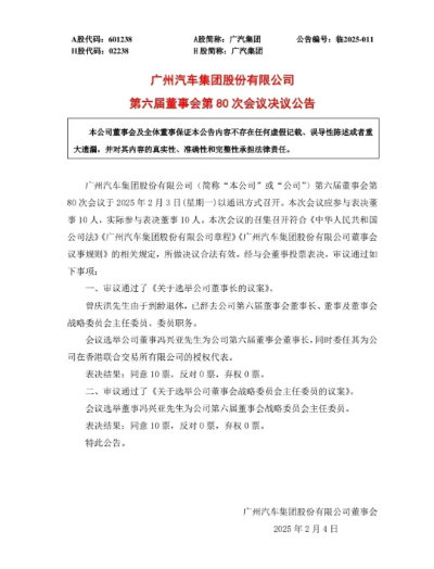 據(jù)廣汽集團官方消息,2025年2月3日,廣州集團第六屆董事會第80次會議于以通訊方式召開。會議審議通過了《關于選舉公司董事長的議案》。曾慶洪先生由于到齡退休,已辭去公司第六屆董事會董事長、董事及董事會戰(zhàn)略委員會主任委員、委員職務。公司董事會對曾慶洪先生在任職期間為公司發(fā)展所做的卓越貢獻表示衷心的感謝。會議選舉公司董事馮興亞先生為公司第六屆董事會董事長。