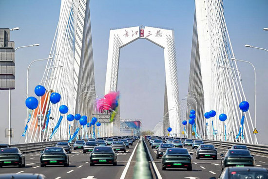 圖為3月18日,奇瑞全品牌車型組成的百車方陣,以智駕模式跨越蕪湖長江三橋