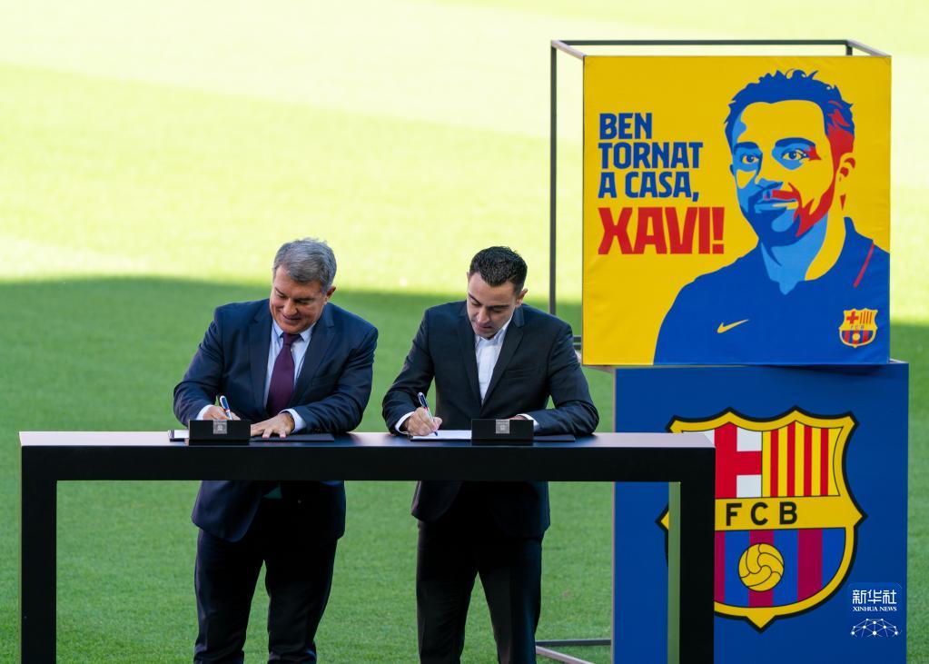 11月8日,哈維(右)與巴塞羅那俱樂(lè)部主席拉波爾塔在諾坎普球場(chǎng)簽署協(xié)議。