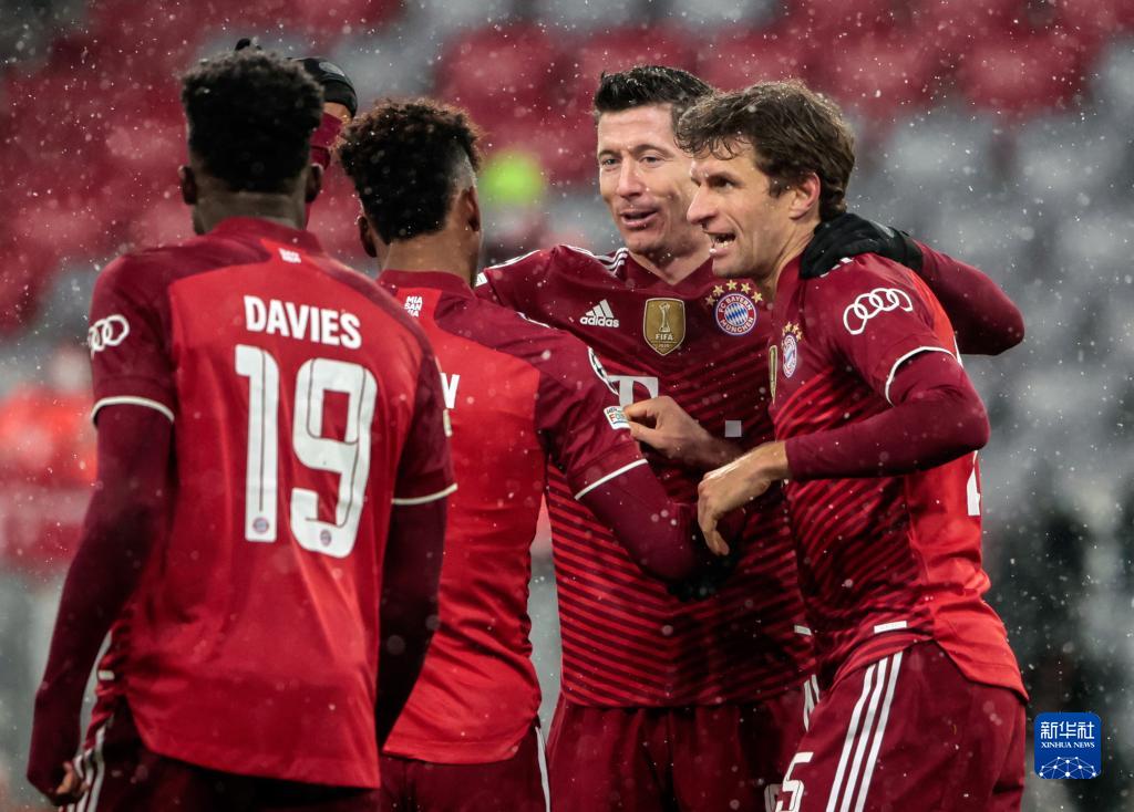 12月8日,拜仁慕尼黑隊(duì)球員穆勒(右一)在比賽中進(jìn)球后與隊(duì)友慶祝。