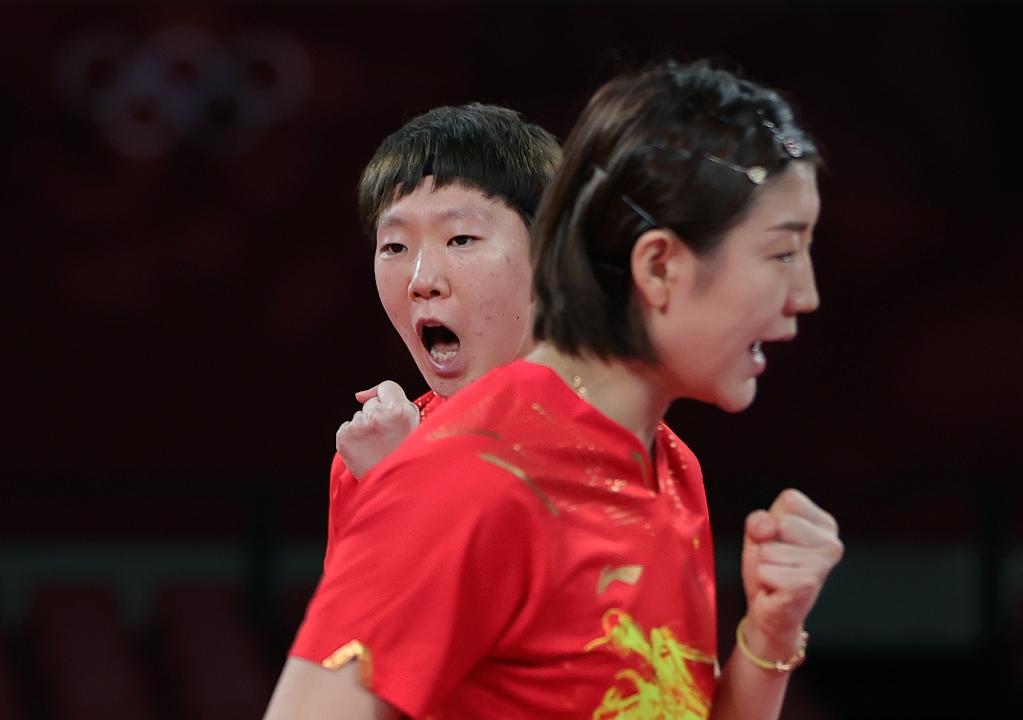 8月4日,中國(guó)隊(duì)組合陳夢(mèng)/王曼昱(左)在比賽中。當(dāng)日,在東京奧運(yùn)會(huì)乒乓球女子團(tuán)體半決賽中,中國(guó)隊(duì)?wèi)?zhàn)勝德國(guó)隊(duì),晉級(jí)決賽。新華社記者 王東震 攝