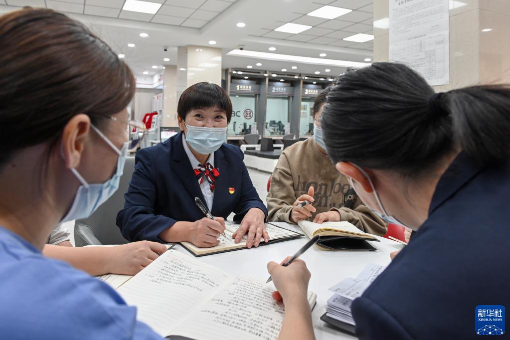 在中國工商銀行新疆烏魯木齊的一處營業(yè)網(wǎng)點,李鵬與員工進行業(yè)務交流(2022年9月24日攝)。新華社記者 郝建偉 攝