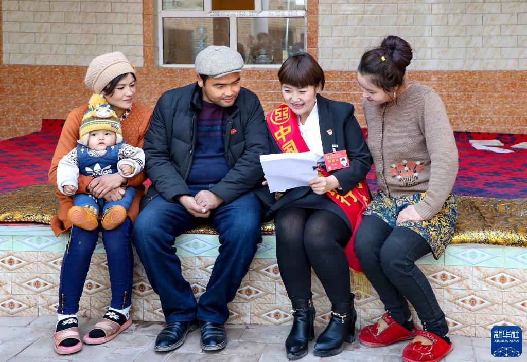 李鵬在新疆喀什地區(qū)疏勒縣塔尕爾其鄉(xiāng)塔尕爾其村向村民進行理論宣傳(2017年12月攝)。新華社發(fā)