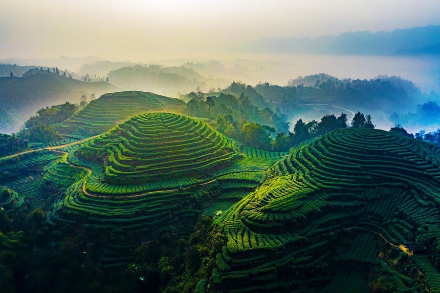 念好“優(yōu)、綠、特、強、新、實”六字經(jīng),大力培育川糧油、川菜、川茶等十大優(yōu)勢特色產(chǎn)業(yè),進一步打響“川字號”品牌。圖為四川省雅安市名山茶園。