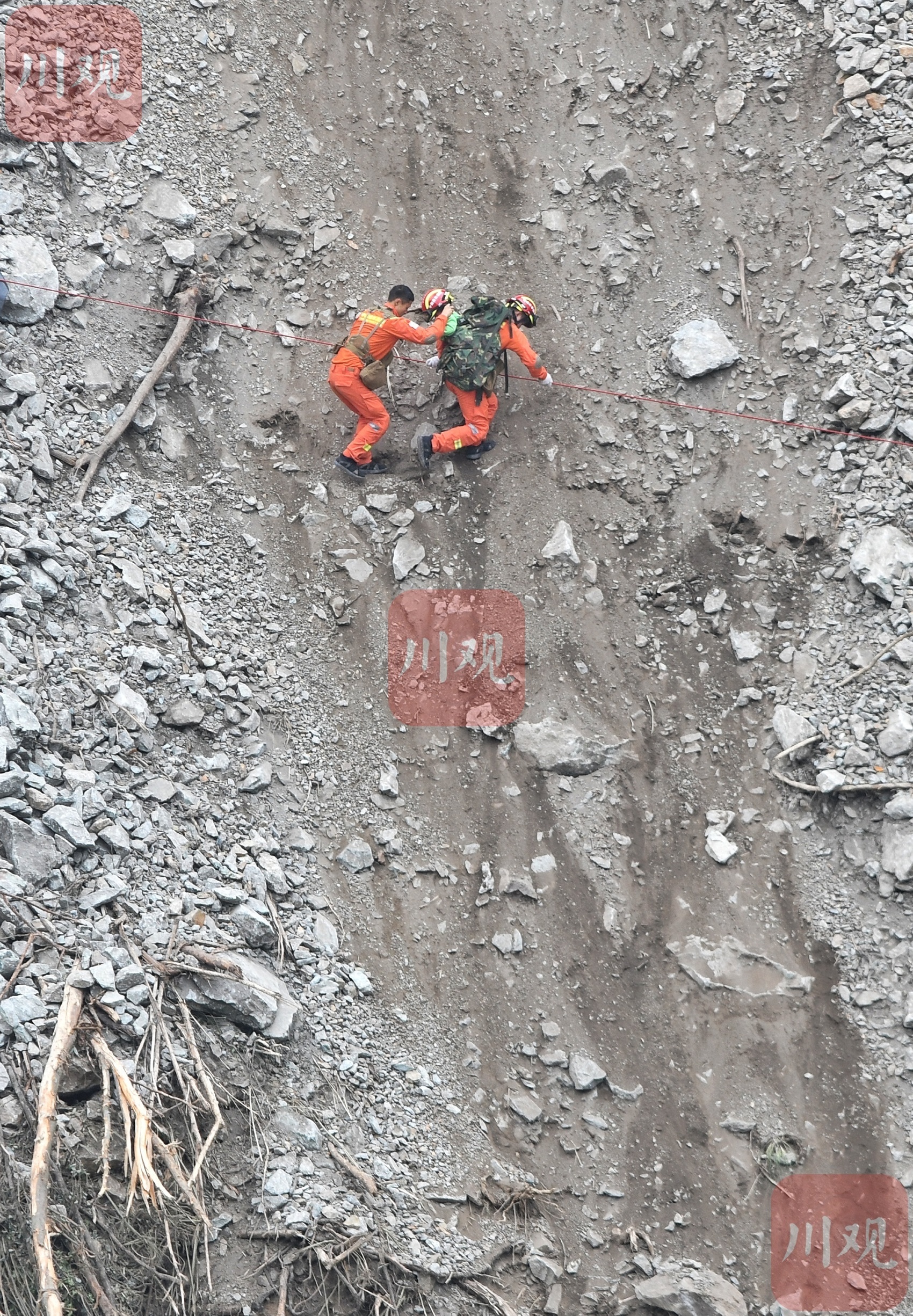 震后營救,救援人員背負兩歲幼童穿越百米垂直滑坡帶。華小峰 攝
