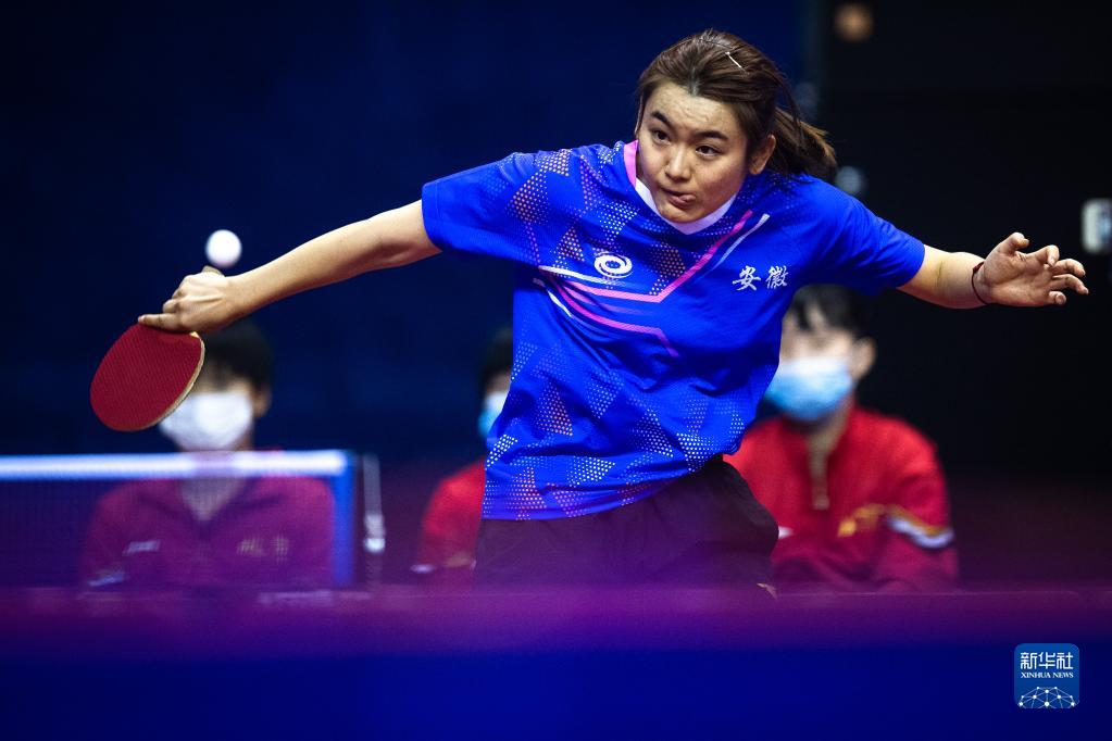 11月3日,安徽國軒隊(duì)球員劉斐在比賽中回球。劉斐在女子團(tuán)體首輪比賽中以3比0戰(zhàn)勝北京隊(duì)球員李雅可。新華社記者 肖藝九 攝