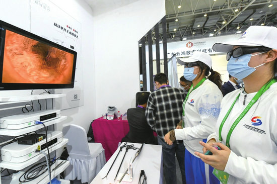 第十屆科博會(huì)上,志愿者佩戴特殊眼鏡觀看3D電子內(nèi)窺鏡屏幕(新華社記者 唐文豪 攝)
