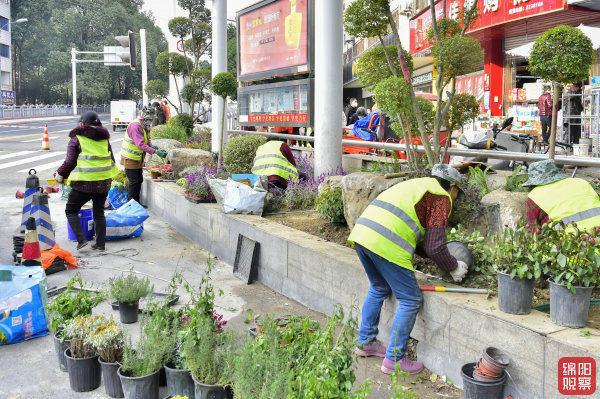 ↑12月18日,涪城路與南河路交匯十字路口,綠化工人栽植花卉。