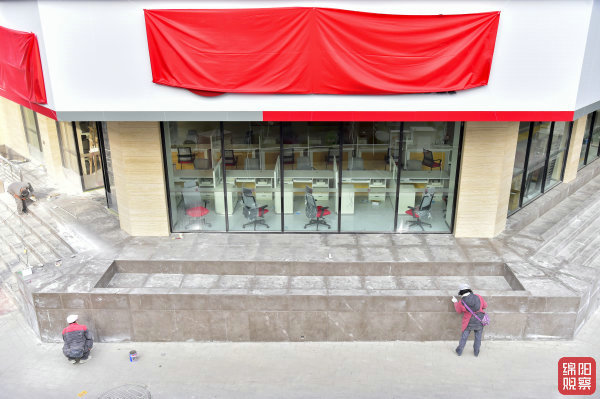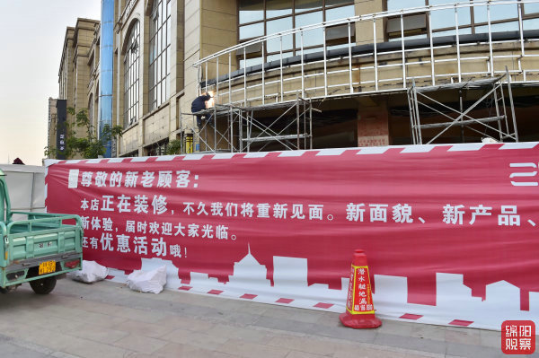 ↑12月18日,城區(qū)天津橋一側,裝修中的門面上掛上了大紅布。