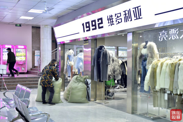 ↑12月18日,公園口地下商城,老板從倉庫拉來三大包服裝,忙著給店鋪補貨。