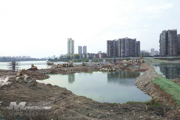 冬日的涪江上,寒風(fēng)吹拂,江水泛起道道漣漪。但金外灘跨涪江人行橋建設(shè)項(xiàng)目施工現(xiàn)場(chǎng)卻一派熱火朝天的景象:一輛輛滿載沙石的大卡車來(lái)回穿梭,一臺(tái)臺(tái)挖掘機(jī)舞動(dòng)機(jī)械臂清理淤泥、安放涵管……