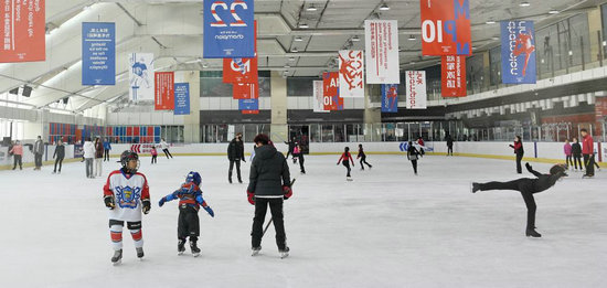 2月9日,孩子們?cè)诔?yáng)大悅城的冰雪運(yùn)動(dòng)館體驗(yàn)和學(xué)習(xí)滑冰、冰球等冰上運(yùn)動(dòng)。新華社記者李欣攝