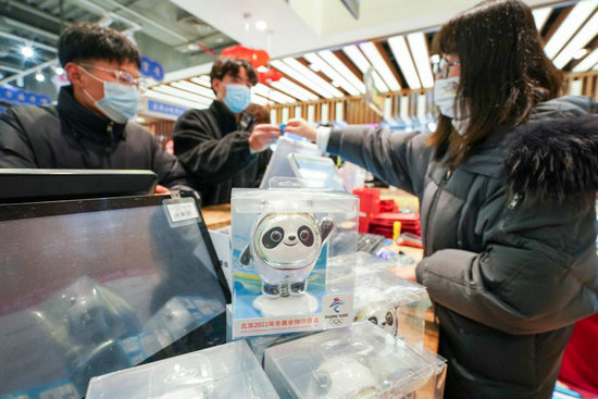 2月10日,市民在江蘇南京一處北京2022年冬奧會(huì)官方特許商品零售店內(nèi)購(gòu)買“冰墩墩”。新華社記者李博攝