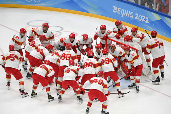 2月10日,中國(guó)隊(duì)球員在北京冬奧會(huì)男子冰球小組賽前。新華社記者李紫恒攝