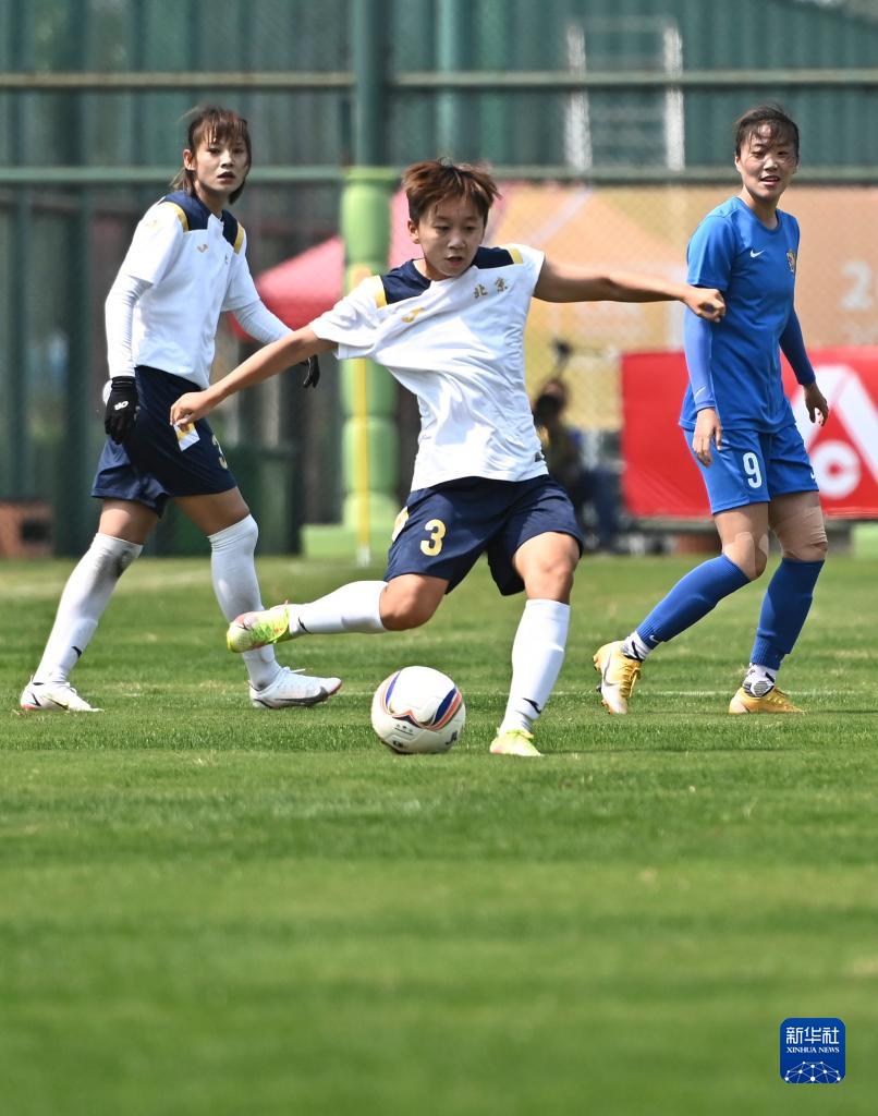 4月7日,北京女足隊球員彭雨瀟(中)在比賽中傳球。