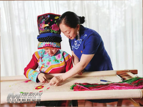 羌繡技師在作坊指導(dǎo)刺繡(左勤 攝)