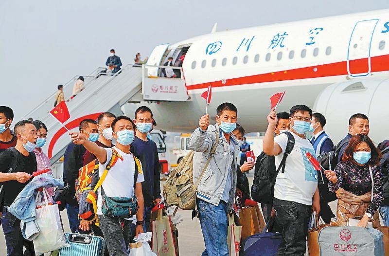 川籍務(wù)工人員乘坐農(nóng)民工返崗專機(jī)回廣州上班。 四川在線記者 華小峰 攝(資料圖)