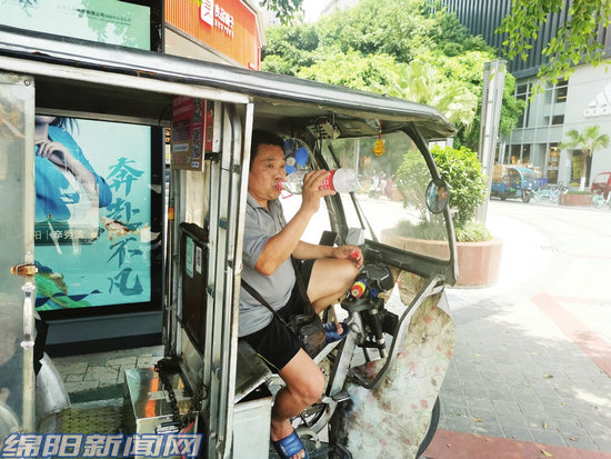 7月11日11時,涪城區(qū)北街,三輪車師傅趙光軍一邊將車停放在陰涼處,一邊說:“我今天早上一共跑了4單,天氣太熱了,需要不停喝水。”趙光軍說完打開駕駛座邊的儲物箱,笑著指了指里面的大號茶杯,為了補充水分,他還準(zhǔn)備了一瓶1.5升的礦泉水。