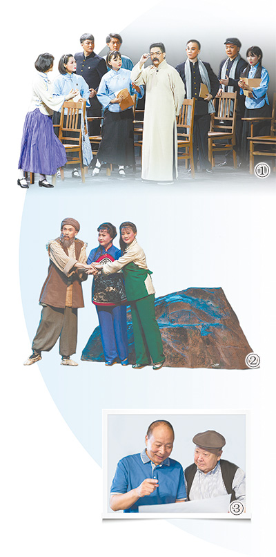 圖③:創(chuàng)作《天下歸心》過程中,朱紹玉(左)和京劇表演藝術家尚長榮說唱腔。
