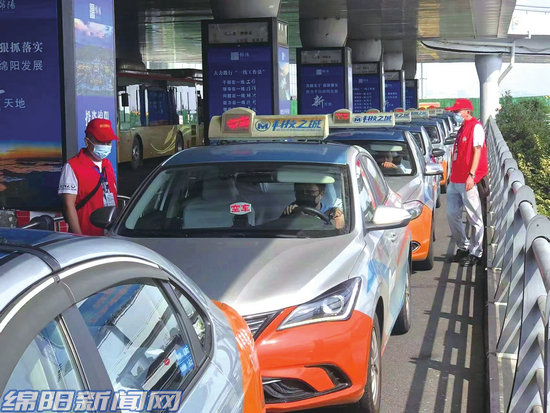 黃藍(lán)色的出租車輛整齊排列,周圍豎立著文明規(guī)范服務(wù)的提示牌,乘客上車即走,隨后車列依次前移,過程不過三五秒,快速高效。這一幕發(fā)生在綿陽站外的出租車乘坐區(qū)(如圖)。