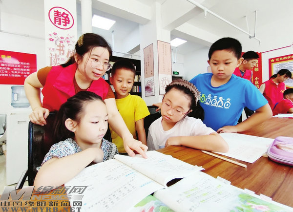 近日,在經(jīng)開區(qū)塘汛街道三江社區(qū)海賦長(zhǎng)興小區(qū)黨支部?jī)?nèi),“愛心暑期托管班”的孩子在志愿者的幫助下學(xué)習(xí)。(綿報(bào)融媒記者 陳冬冬 攝)