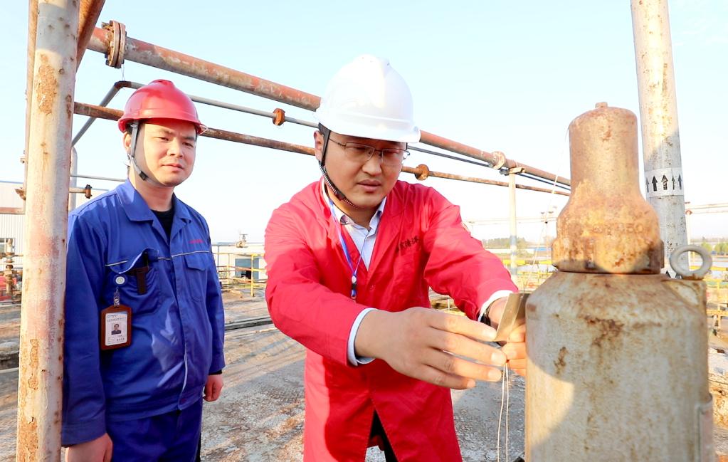 圖為陳亞鵬(右)與化工企業(yè)員工一起檢查生產設備。