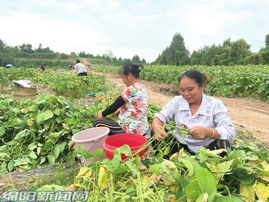 綿陽新聞網(wǎng)訊 近日,在三臺縣西平鎮(zhèn)紅梁村一片綠意盎然的田地里,隨處可見村民采摘、搬運大豆忙碌的身影,一幅幅多彩的豐收畫卷在這里展開。高聳的玉米還為村民們形成天然的遮陽傘,大家抓緊時間搶收。