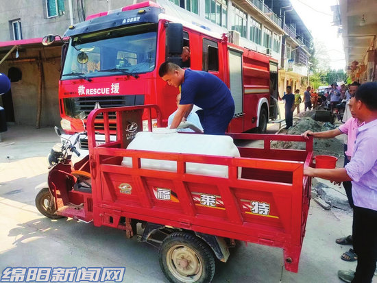 鹽亭縣消防救援大隊為群眾送水。(綿報融媒記者 任明勇 攝)