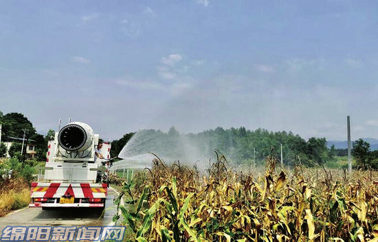 8月18日,在北川永昌鎮(zhèn)高安村,一臺滿載著15噸水的環(huán)衛(wèi)灑水車平穩(wěn)地行駛在村道上,一股股清流灑進(jìn)干涸的玉米地。(云峰 綿報融媒記者 李春梅 攝影報道)