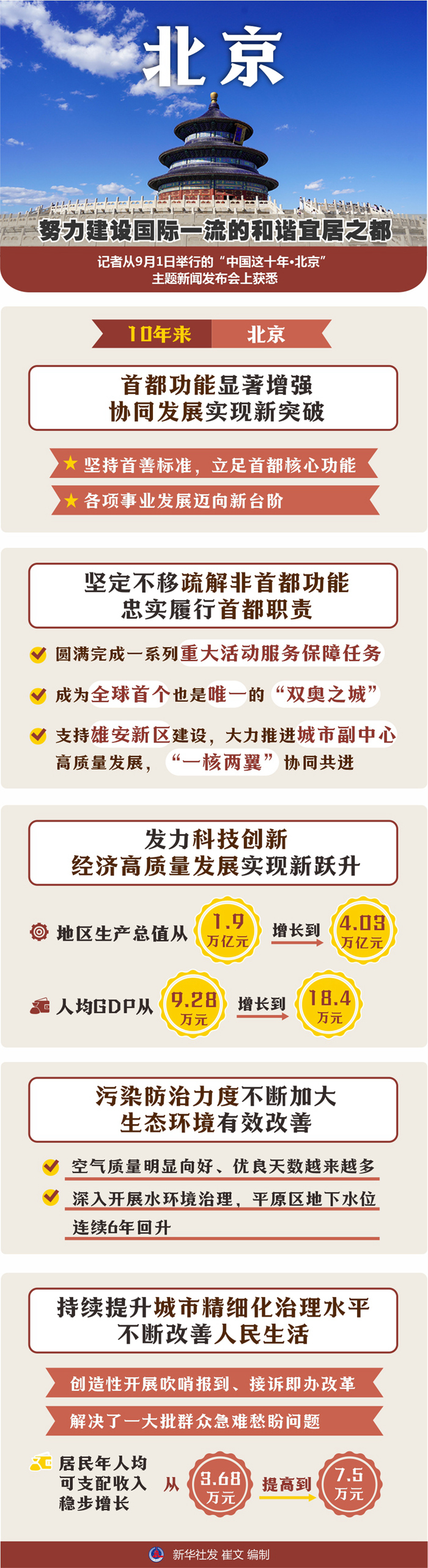 新華社北京9月1日電(記者王君璐)記者從1日舉行的“中國這十年·北京”主題新聞發(fā)布會上獲悉,黨的十八大以來,北京深入貫徹落實習(xí)近平總書記重要指示精神,全市上下牢記囑托、勇?lián)姑?,全面貫徹新發(fā)展理念,融入新發(fā)展格局,求真務(wù)實、砥礪奮進(jìn),努力建設(shè)國際一流的和諧宜居之都,在全面建設(shè)社會主義現(xiàn)代化國家新征程上奮力譜寫首都發(fā)展新篇章。