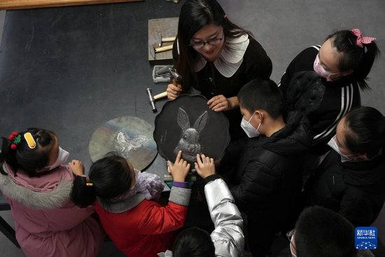 1月12日,在石家莊市新華區(qū)一個(gè)文化工作室,一名鐵板浮雕藝人向小朋友展示生肖兔作品。新華社記者 駱學(xué)峰 攝